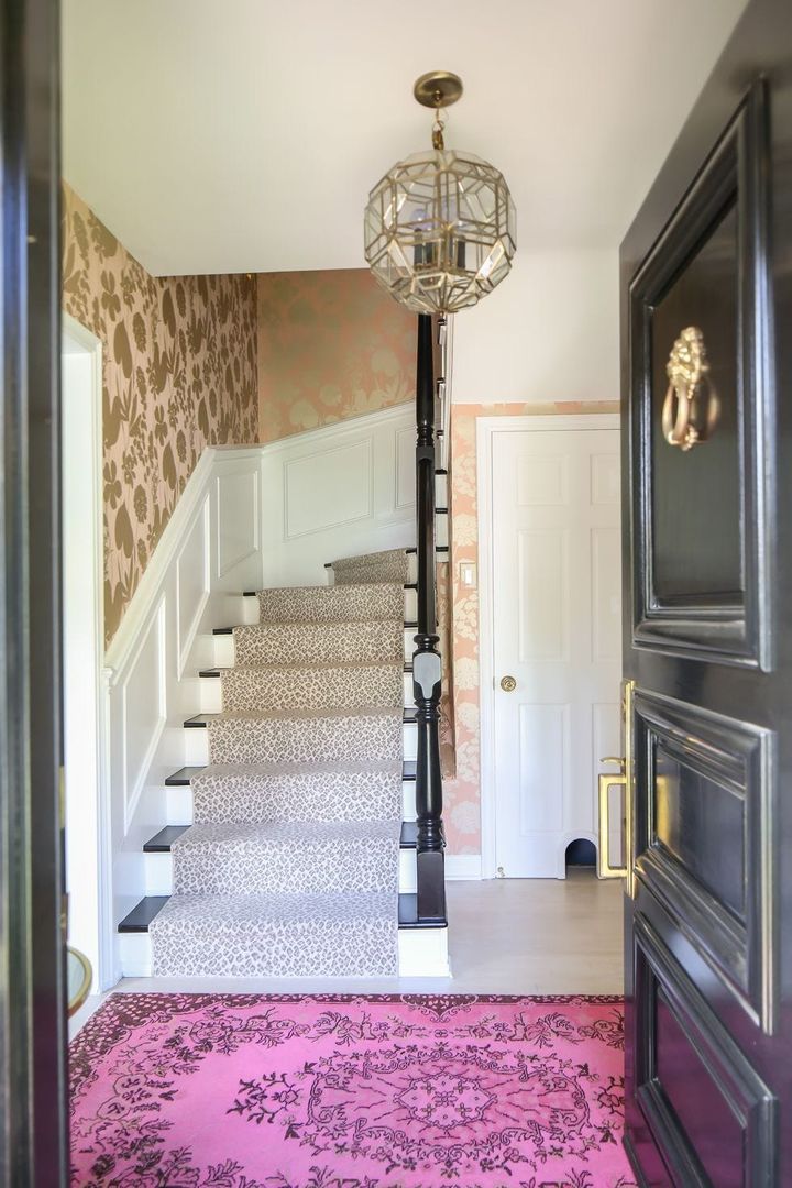 レオパード柄の階段マットに、メタリックな壁紙。そこに腰壁を組み合わせた、ジェロッド・ブランディーノとジェレミー・ジョンソンの邸宅の玄関ホール。この空間には、温かく迎え入れてくれるような心地よさと、一分の隙もない華やかさが共存している。