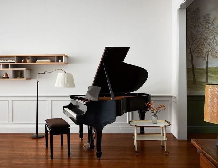 腰壁と壁面をあえて同じ清潔感のあるホワイトで統一したことで、「スタインウェイ&サンズ」の艶やかなピアノが、主役としていっそう引き立つ。そこに、ジャック・アドネのすらりと伸びたフロアランプが加わり、空間の完成度をさらに高めている。