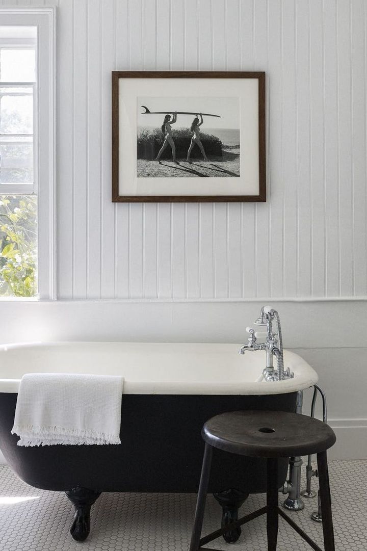 白と黒。そして、圧倒的な洗練。アーネスト・デ・ラ・トーレがニューヨーク州北部に構える自宅のバスルームは、まさにそのお手本。「ベンジャミンムーア」の“ミッドナイト”で塗られた黒い腰壁が、シャンテル・マーティンの壁画に描かれた黒のラインや遊び心たっぷりのイラストと響き合い、空間を見事に引き締めている。