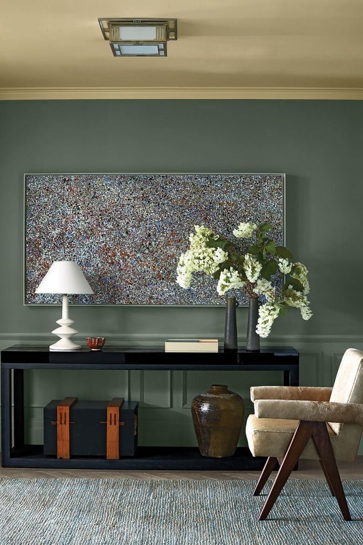 ドラマチックな演出を加えて、腰壁を部屋の主役に仕立ててみよう。このロサンゼルスの邸宅では、壁一面の腰壁を「ベンジャミンムーア」の“ジュニパーグリーン”で塗装。その鮮やかな色彩が、黒い天井やダイニングセットを背景に見事なコントラストを描き出している。