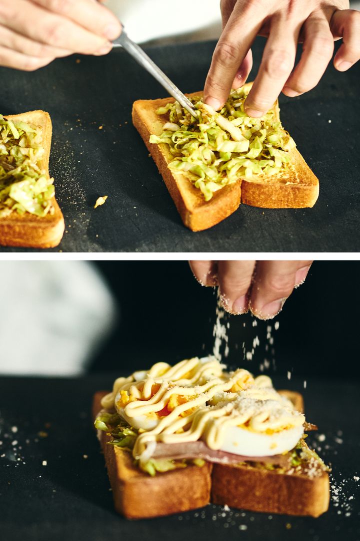 あらかじめ焼いた食パンに、春キャベツ、生ハム、ゆで卵を重ねる。味の決め手になるのはマヨネーズと粉チーズだ。