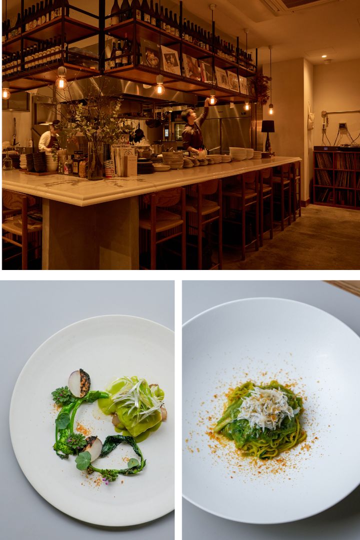 おすすめの料理は「菜の花と芹、柚子胡椒のタリオリーニ/山利しらす」(写真右)や「寒鰆のヴァプール/発酵白菜/芹のバターソース」(写真左)といった、旬の食材と和の調味料、全国の生産者や漁師から取り寄せた食材を掛け合わせた、シンプルながらも驚きに満ちた味わい。