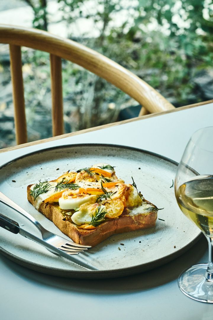 その味わいは、重層的でありながら驚くほど軽やか。そんな西さんのセンスが凝縮された今回の一皿は「春キャベツと金柑、モッツァレッラのトースト」だ。