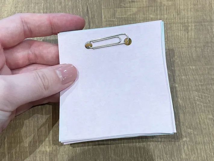 輪ゴムとゼムクリップがしっかりと紙の束をまとめてくれる、メモパッドの完成です!