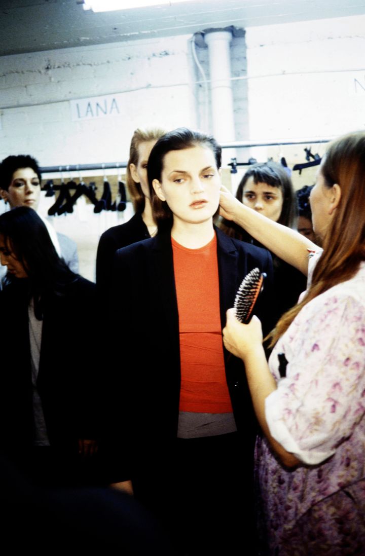 「カルバン クライン」1997年春夏ショーのバックステージにて、グィネヴィア・ヴァン・シーナスの姿。 WWD / Getty Images