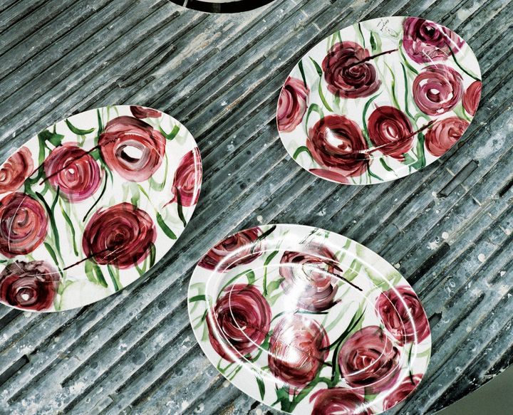 自宅の庭で30品種以上のバラを育てているトゥーグッドが、自身の手で模様を描いたプレート。「ノリタケ」の精密な技との対比が新鮮だ。手描きのものはコレクションピースとして販売され、その絵をプリントしたバージョンも発売予定。