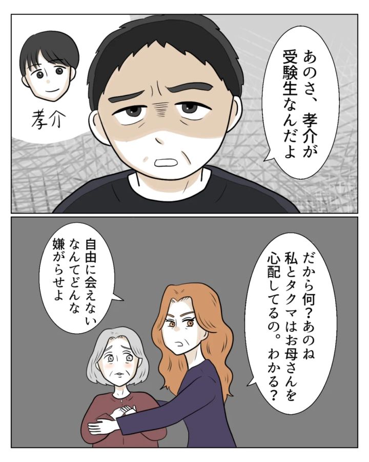 和也さんは、受験生の孝介がいるから配慮してほしいと伝えますが、エミさんは「だから何?あのね、私とタクマはお母さんを心配してるの。自由に会えないなんてどんな嫌がらせよ」とお得意の被害者面。義母は終始嬉しそう。ですがこれだと、私たちが義母に意地悪をしているような構図に見えてしまいます。