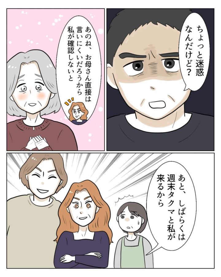 和也さんもエミさんにしっかり「迷惑」だと伝えましたが、エミさんは「お母さん、直接は言いにくいだろうから私が確認しないと」と聞く耳を持ちません。義母は自分の味方をしてくれるエミさんの態度にとても嬉しそうです。すると突然エミさんが「しばらくは週末、タクマと私が来るから」と言い出しました。