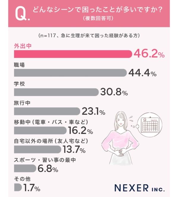 NEXERはこのほど、Angelite(アンジェライト)と共同で、全国の女性200名を対象に「急な生理の経験について」のアンケートをおこないました。