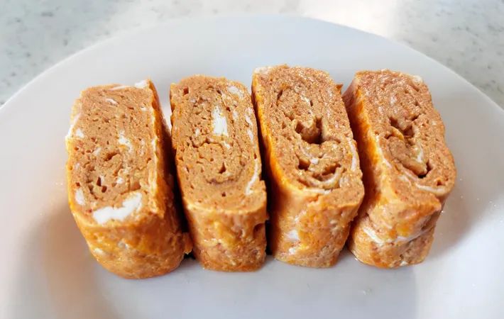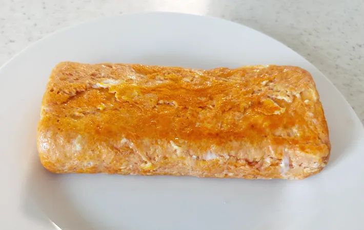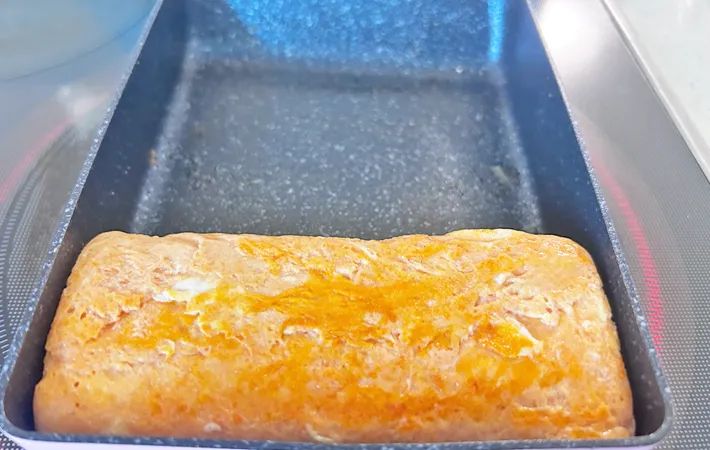 焼き上がった玉子焼きはほんのりオレンジ色。思ったよりトマトの赤い色は出ませんでした。
