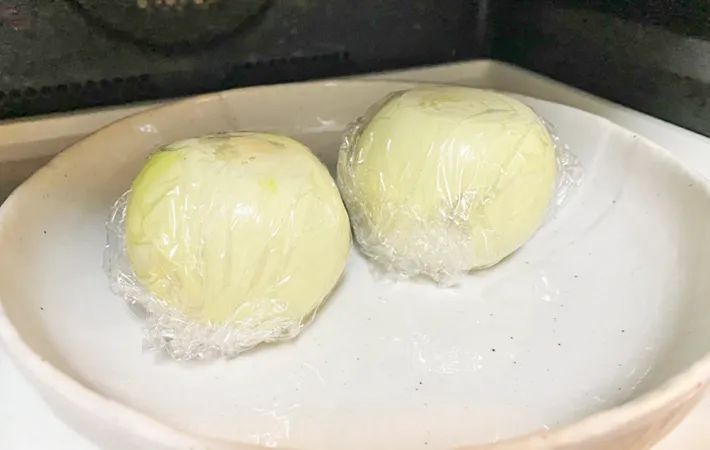 タマネギをラップで包み、耐熱容器に乗せたら、600Wに設定した電子レンジで5分加熱しましょう。