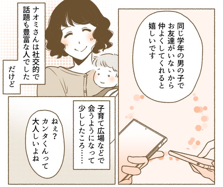私(ハルカ)は、現在育児休業中。夫と生後3か月の息子・カンタとの3人暮らしをしています。ようやく赤ちゃんのいる生活に慣れてきました。けれど初めての出産はすべてが未知の世界。発達速度なども気になるので、市が開催している子育て相談会に行ってみたのです。しかし周りの子たちとわが子の発達を比べて落ち込むだけでした。恥ずかしくて相談もできず、暗い気持ちになっていたのですが、そこでママ友・ナオミさんと出会います。それから定期的に会うようになったのですが……?