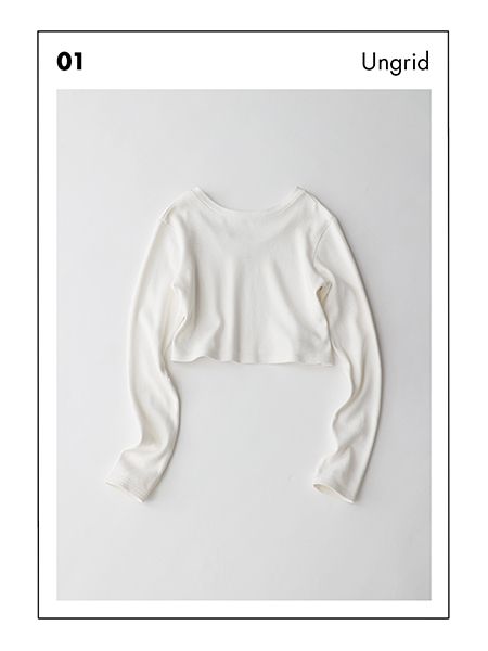 深い開きでもいやらしくない、ボーイッシュな風合い。手の甲までおおうサムホールつきの長いそでと、コンパクトな丈が好バランス。ワイドデニムや厚手素材のスカートなど、主役ボトムに悩まず合わせられる優れもの。 オフ白クロップトロンT/Ungrid