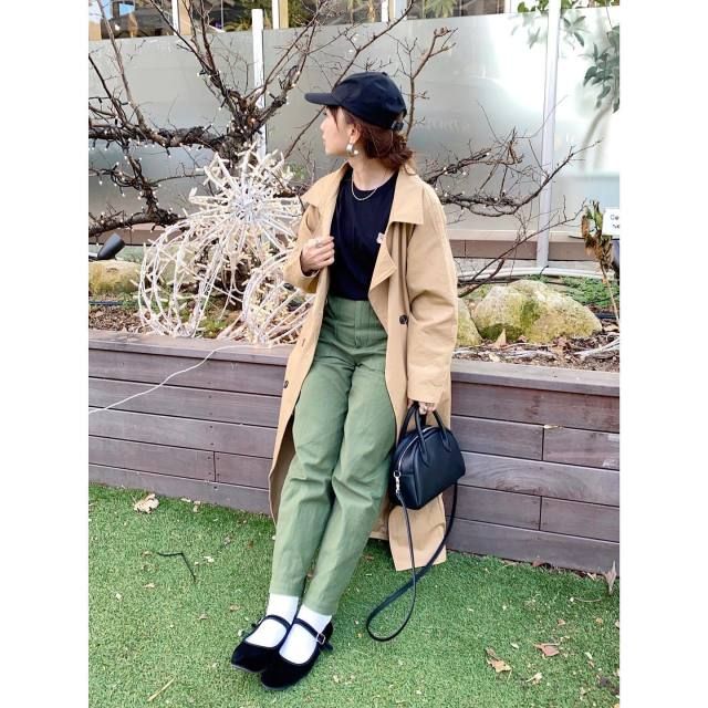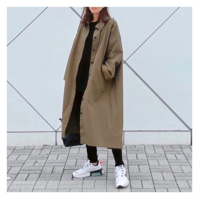トレンチコートよりも軽やかに着こなしたい方には「ステンカラーコート」がおすすめ。カジュアルな服に似合うアウターなので、黒Tシャツコーデがしっくりまとまります。