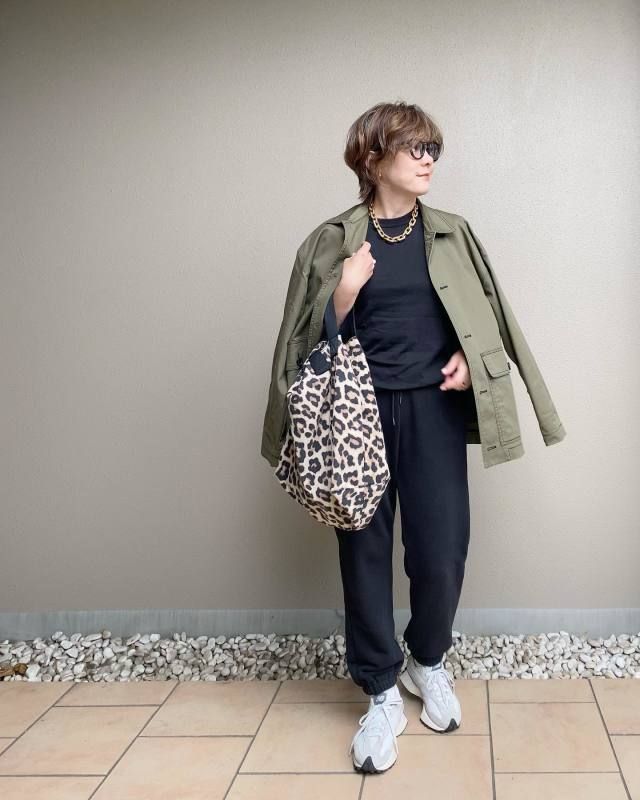 このときカーキ×黒の配色はくすんで見えやすいので、ネックレスを合わせるのがおすすめ。顔まわりにツヤが生まれ、女性らしく装えますよ。