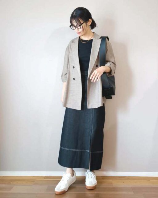 シックな黒Tシャツは「テーラードジャケット」にもハマります。カッチリしたジャケットがきちんと感を醸し出し、カジュアルコーデを大人っぽくアップデート。ここにきれいめなボトムと靴を合わせれば、通勤コーデにも活用できますよ。