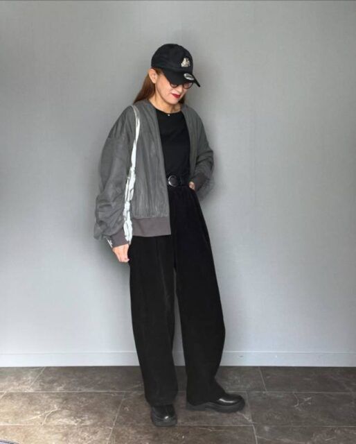 上半身がベーシックな重ね着スタイルにまとまるので、ボトムには今シーズン主流のゆったりパンツを合わせましょう。黒Tシャツ×デニムジャケットの王道コーデにトレンド感が加わりますよ。