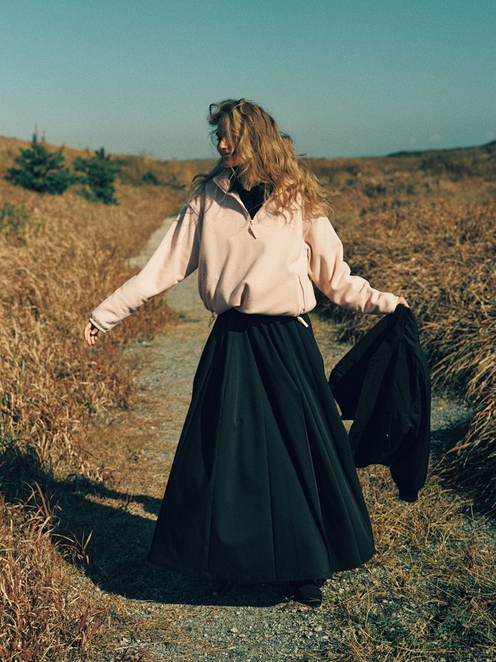 モノトーンの気分転換に適した黒に合う白っぽいピンク。フリースのプルオーバーで旬のスポーティなムードをプラス。迫力のある黒のフレアスカートと合わせるなら、すそのドロストをしぼり、形は極力コンパクトに。