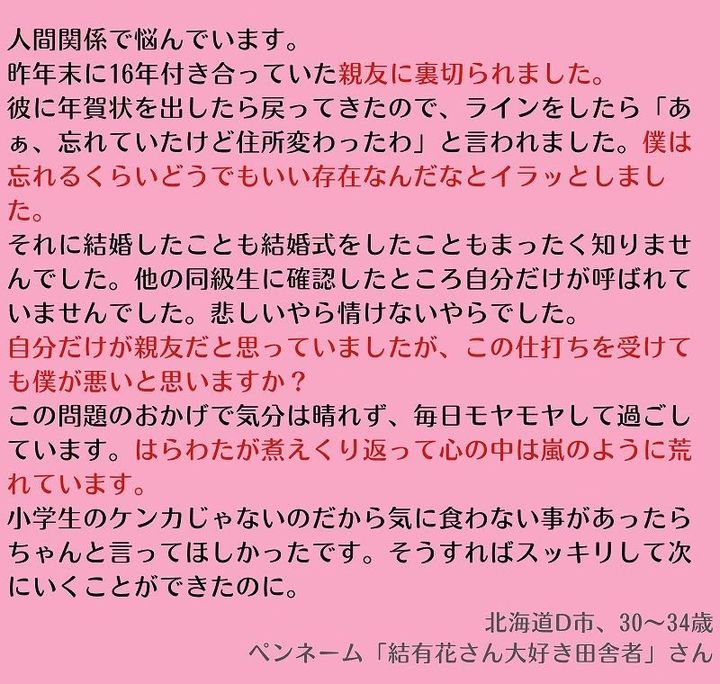 読者からのお悩み「親友に裏切られ、怒り心頭。毎日モヤモヤして過ごしています」