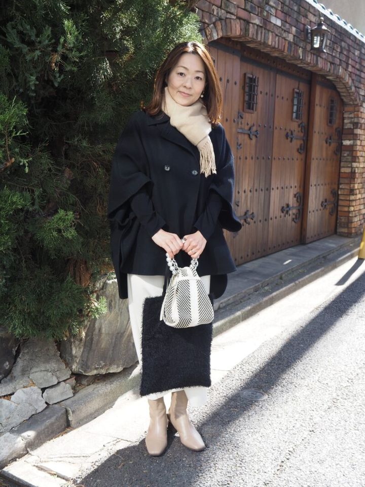 Aさんの冬の定番は、羽織るだけでサマになるポンチョ型のショートコート。袖のボリューム感や前後差のある丈が立体的なシルエットを生み出し、コーディネートに奥行きを。小物はベージュやアイボリーをちりばめることで、重くなりすぎずやわらかい印象に仕上がります。
