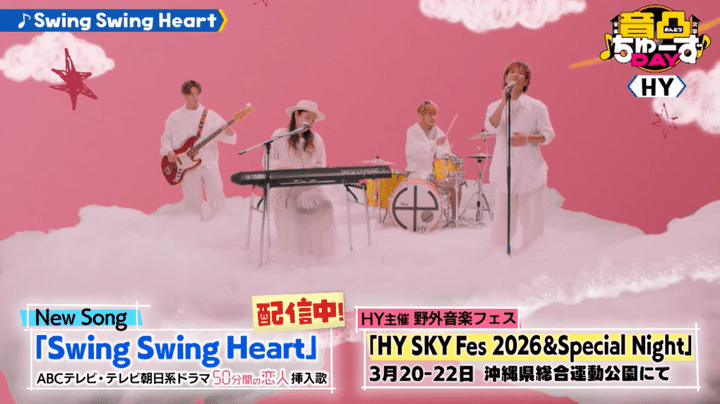 1月期ドラマ「50分間の恋人」毎週日曜よる10時15分~ABCテレビ・テレビ朝日系全国ネット)の挿入歌となる最新曲「Swing Swing Heart」が配信中! 3月には野外音楽フェス「HY SKY Fes 2026 & Special Night」を主催するHYに“音凸”します!