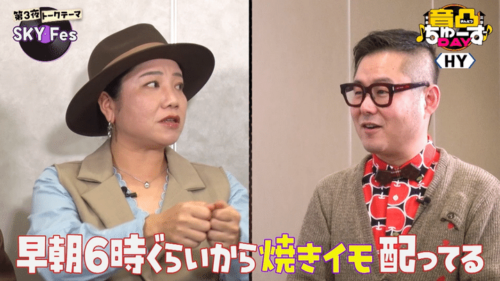 仲宗根さんはその理由を、「(フェスの会場は)普段は誰でも入れる場所なんですよ。いつも使ってる方からすると『なんで今日入れないの?』みたいな感じになるので、『申し訳ないです、また来年もよろしくお願いします』って早朝6時から焼きイモ配ってるんです」と語ります。