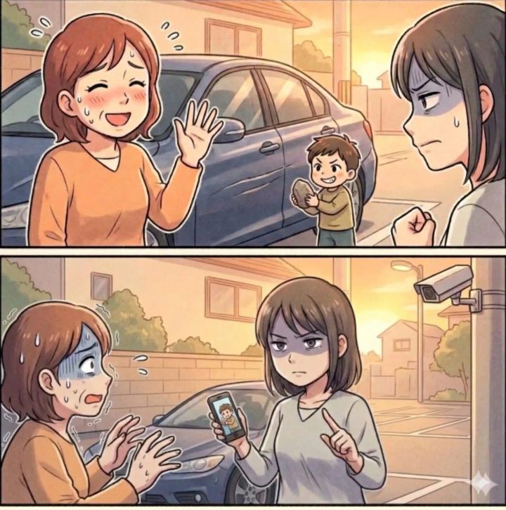 振り返ると、彼女の子供が硬い石を握りしめ、駐車してある車のドアに長い線を描くように傷をつけていたのです。