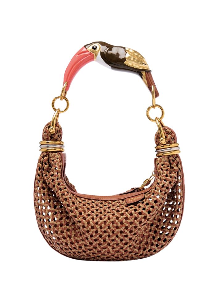 ハンドルに視線集中の「ブレスレット」ホーボー バッグ。カラフルなバードモチーフと2色のレザーを使った編み込みが、サファリチックで好相性。