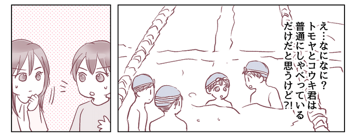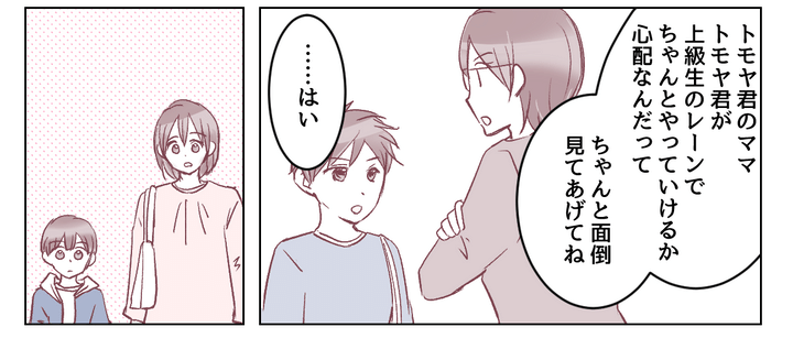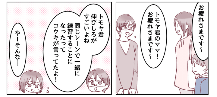 私はヨウコ。小学3年生の息子トモヤは、スイミングの選手コースで頑張っています。私もトモヤの一生懸命な姿を応援しながらサポートしてきました。そんなある日、トモヤが「3年生のレーン」から「4~5年生のレーン」に移るよう言われました。どうやら頑張りを認めてもらえたようです。そのレーンには大好きな5年生のコウキ君もいるし、モチベーションにつながるでしょう。