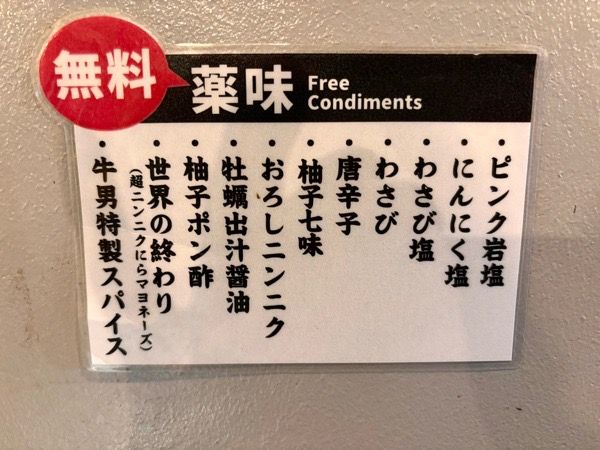 自家製の醤油タレ、味噌タレ以外に無料の薬味がなんと11種類!味変も楽しみ放題です。好みはありますが新鮮な肉にはシンプルにわさびやピンク岩塩が合います。牛男特製スパイスは是非!ホルモン食べ放題以外にもこだわりの自家製ナムルやキムチ、サラダのドレッシングもおいしいです。ご飯とスープはおかわり無料ですよ。 60分食べ放題で食べられたのは2皿でしたが充分満足でした♪