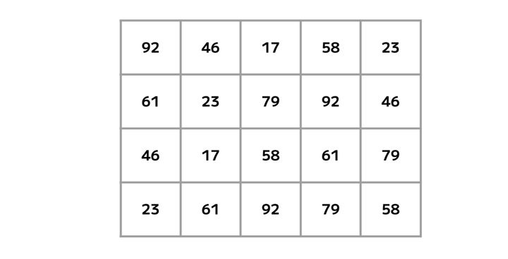 【脳トレ】5×4の表に書かれた7種の数字「17・23・46・58・61・79・92」。1種だけ2つしかない!?その数字はどれだ??