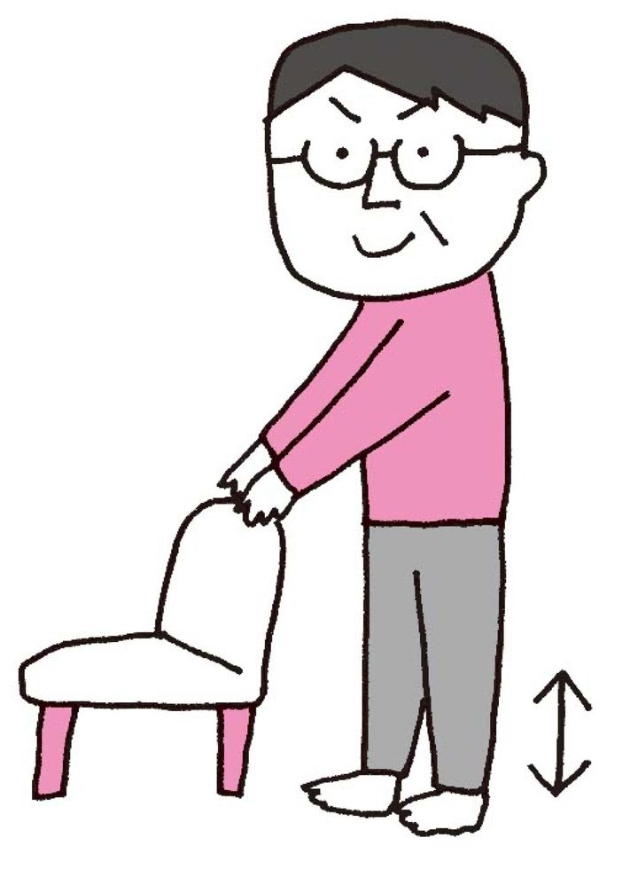 椅子の背もたれをつかみ、足を肩幅に開く。両足のかかとを「1、2、3、4、5」とカウントしながらゆっくりと上げ、同様に5つカウントしながら下げる。
