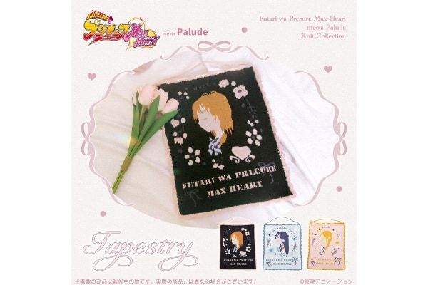 そのほかにも、プリキュアたちのコスチュームを完全手編みで表現した「コスチュームキーホルダー」(2,750円)や、プリキュアたちをニットのジャガード柄で表現した「タペストリー」(3,850円)も登場。