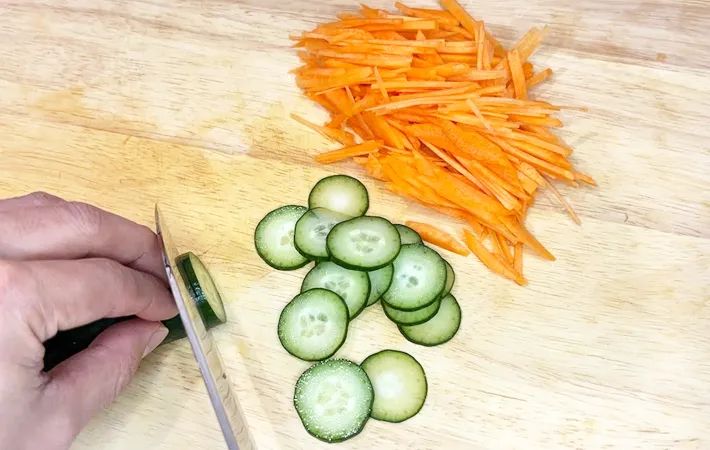 2.ニンジン、キュウリ、タマネギの下準備をする