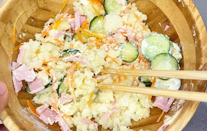 潰したジャガイモに、準備したキュウリ、ニンジン、細く切ったハムを加えます。