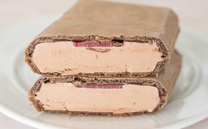 今回の新商品は、ストロベリーソースが入ったチョコレートアイスをココアモナカ皮で挟んだモナカアイスです。