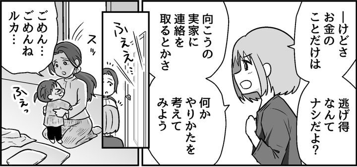「お金のことだけは逃げ得なんてナシだよ?」マリナはこのままうやむやにせず、月々の養育費はしっかり払わせるべきだと言いました。そのとき目覚めたルカがぐずって泣き出します。私は駆け寄るとその小さな体を抱きしめました。