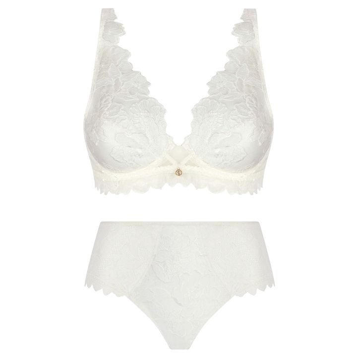 タイ発のランジェリーブランド「アンブラ」。モールドカップのブラは前中心が低いので着けやすく、デイリーに活躍。チョーカー付きというプレイフルなデザインは、「アンブラ」が得意とするもの。ガーターベルト、ソングまでそろえたフルコーディネートで、大人の女性ならではのセクシーな白ランジェリーの着こなしを楽しんで。