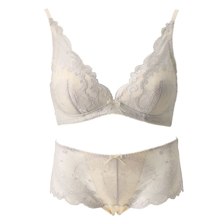 独自の立体パターンやていねいな縫製で知られる日本ブランド「ツェルマット」。総レースのソフトブラは、取り外し可能なパッド付き。胸もとがスクエアラインになっているので、「肌見せファッションは楽しみたいけれど、胸の谷間が見えるのは避けたい」という方にピッタリ。きゃしゃなデザインなのにヒップはしっかり包むショーツとセットで。