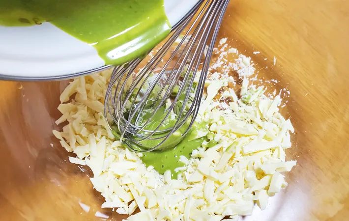 混ぜ合わせた抹茶生クリームを、刻んだホワイトチョコレートに少しずつ加えながら泡立て器で混ぜます。