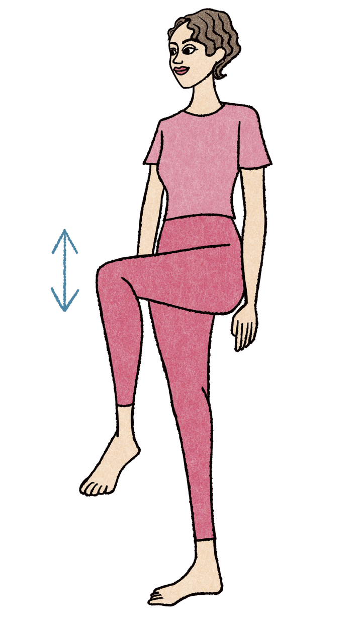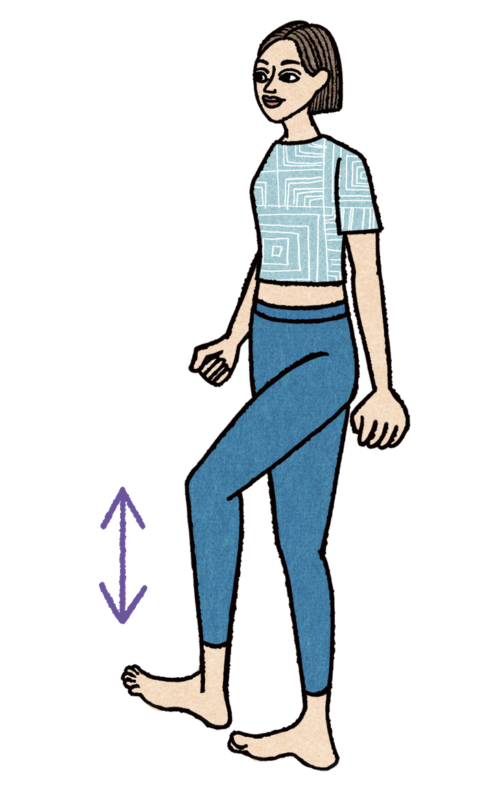 脚をこぶし1個分開いて立ったら、つま先をできるだけ上に向ける。その状態をキープし、その場で足踏みを30秒間行う。すねや足の甲の筋肉が鍛えられ、ケガや痛みの起こりづらい歩き方に。
