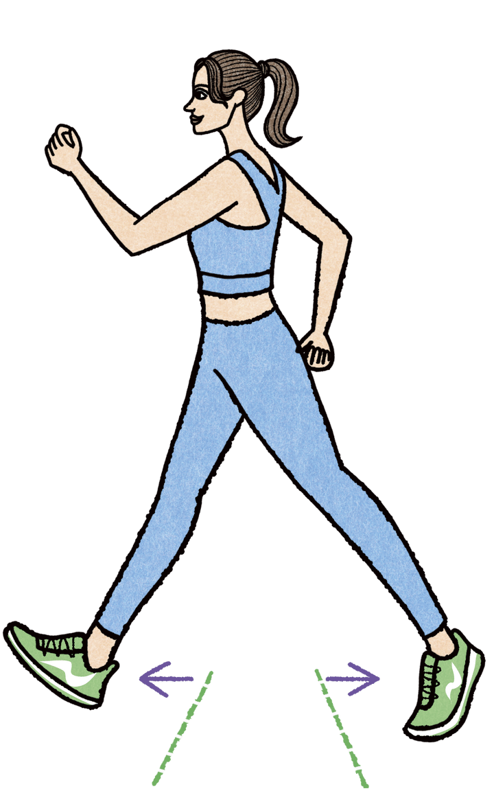 前足は必ずかかとから着地。足幅は、普段より3~5㎝広く取って。