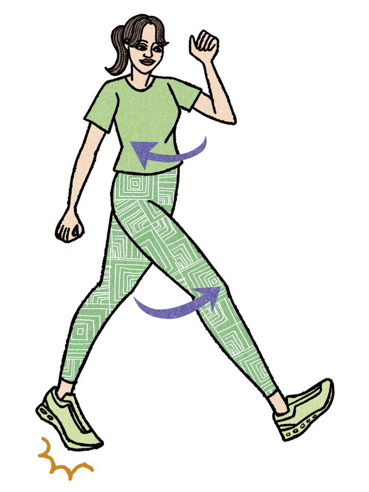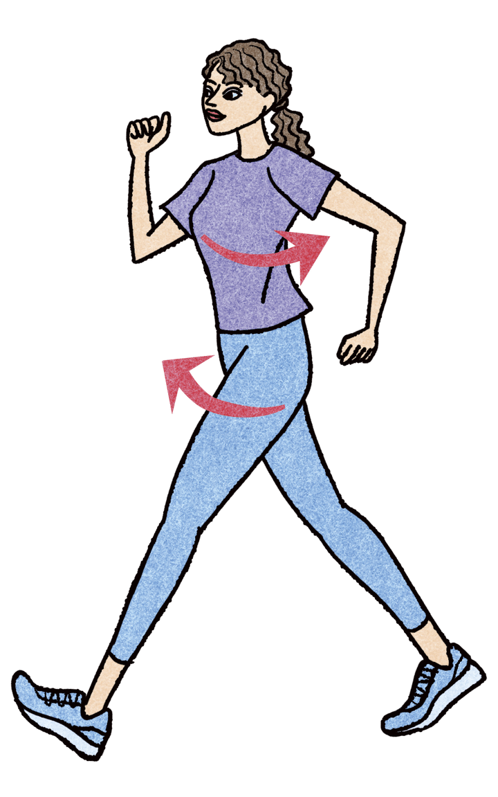 「上半身を右に回転するときは下半身を左に回転するように、ひねりを意識して歩きましょう。慣れない人は、歩く前にウエストを左右にひねる予備運動をしておくと意識しやすくなるはず」