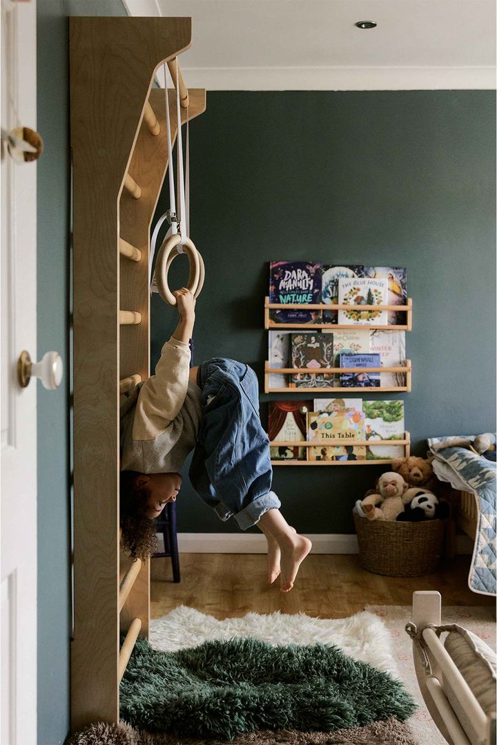 アクティブなフォレストくんの部屋には吊り輪付きのウォールバーを設置。奥には、省スペースでありながら絵本の表紙を見せて収納できる、ウォールマウントの本棚も。