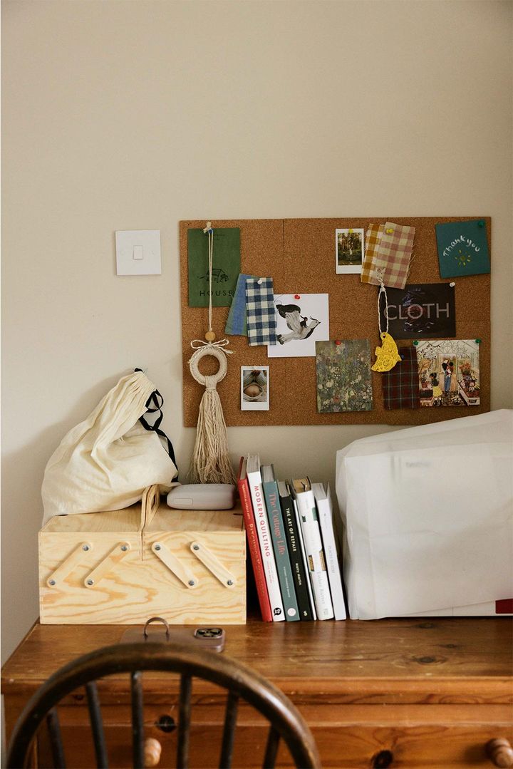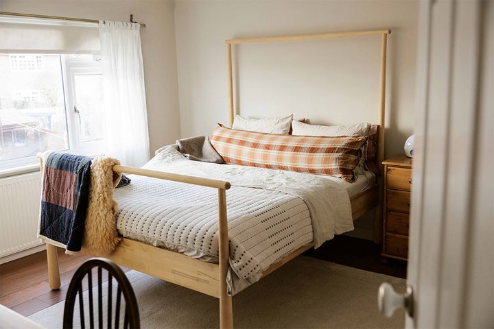 ローラさんがひとりになれる唯一の場所。ソーイングが趣味で、ベッドにかかっているネイビーのキルトは自身で縫い上げたもの。