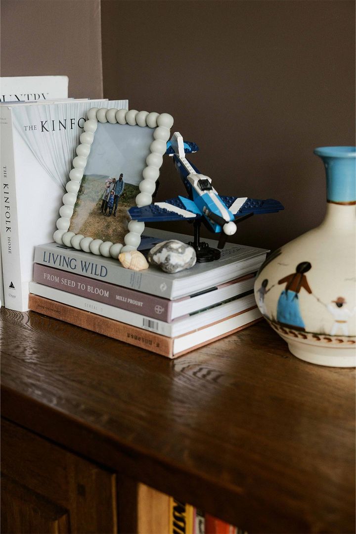 自然派のローラさんらしく、部屋のあちこちに貝殻などのネイチャーを彷彿とさせるものが置かれている。母親から譲り受けた花器の色に合わせて、フォレストくんがつくったブルーのレゴの飛行機をディスプレイ。細部にまで行き届いたカラーコーディネートはさすが。