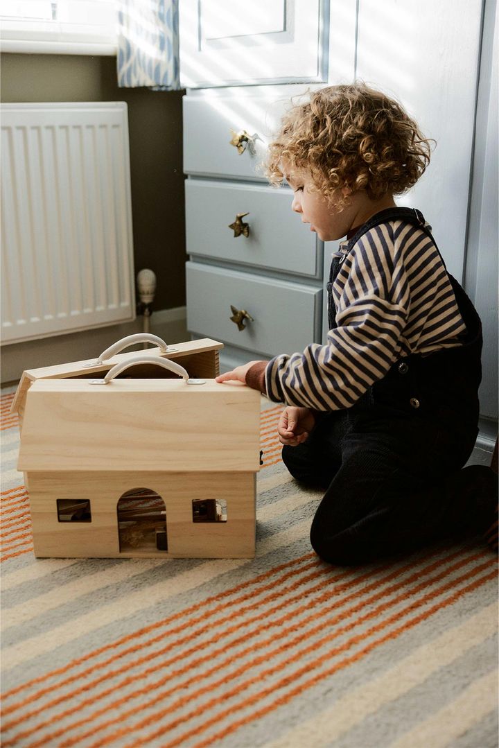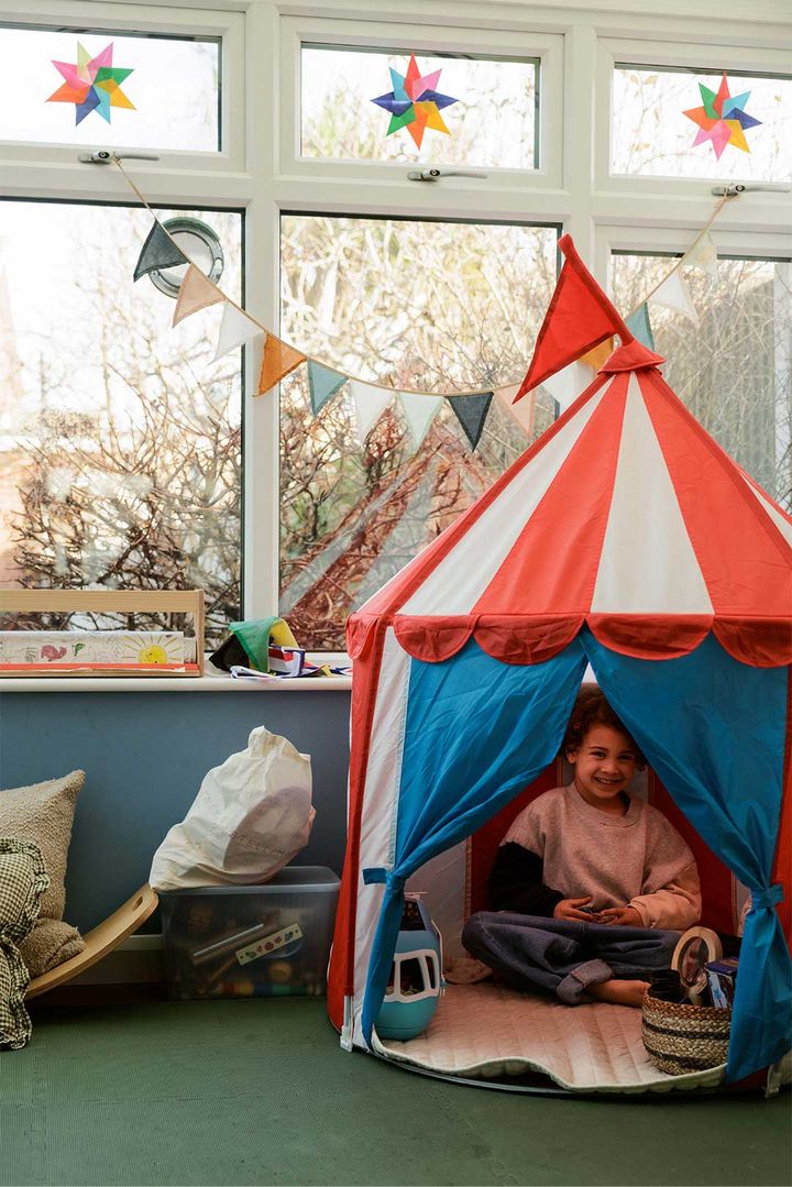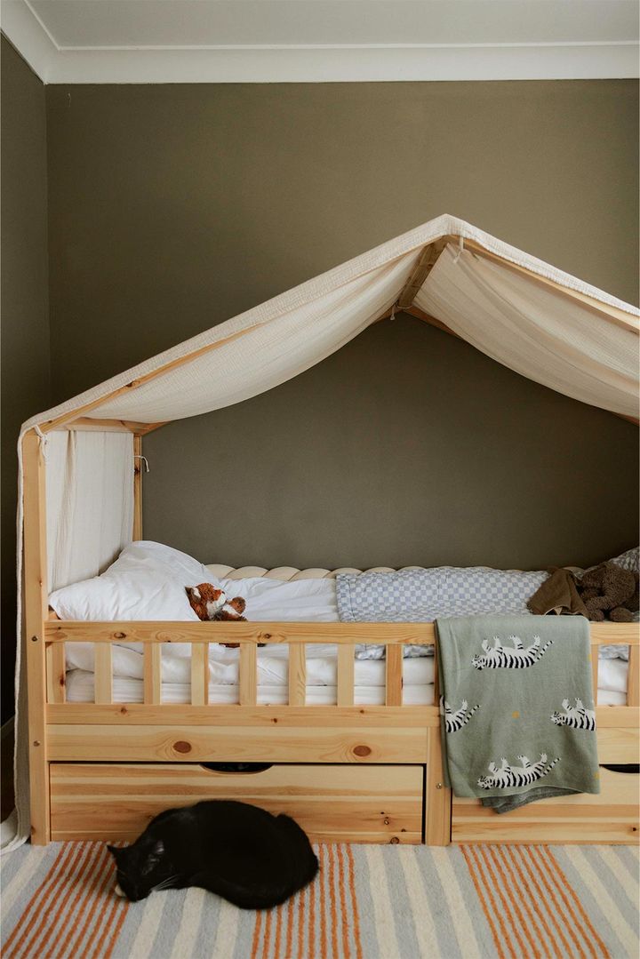 DIYストア〈B&Q〉で購入したハウスベッドのフレームに、〈Petite Amélie〉の上質なコットンルーフを被せ、タナーくんがひとりで安心して寝られる空間をつくり上げた。