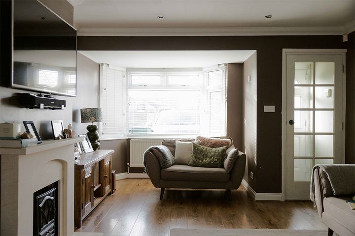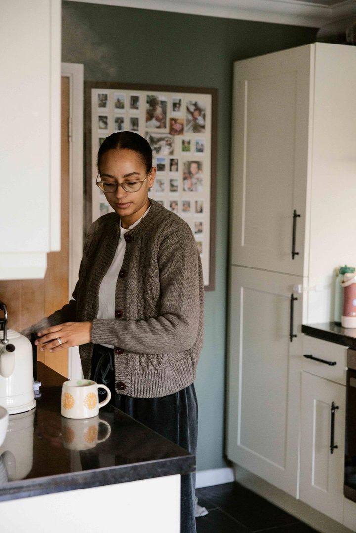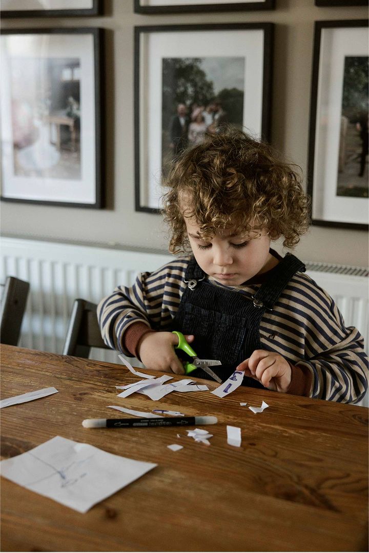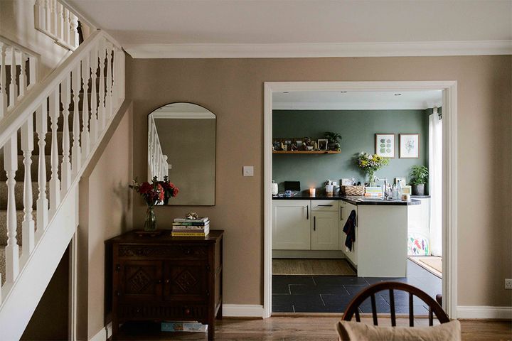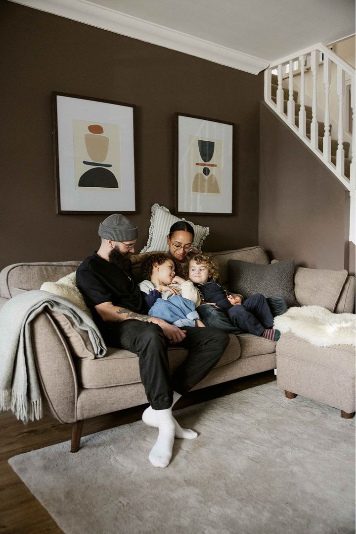 ロンドン郊外の街、ベンフリートで生まれ育ったジョーさんとローラさん。結婚を機に、もともとローラさんの父親が住んでいたというこちらの家を2020年に購入、リノベーションをした。インテリアまわりはすべてローラさんの担当だそうで、「小さな頃から、家具屋さんに通ってデザインを想像するのが趣味だった」というインテリア愛を、夫のジョーさんは全面的にサポートしている。「購入した時点では“お年寄りの家”という感じが強かったので、真っ先にカーペットからフローリングに変え、家中のペンキを塗るところからスタート。子どもたちがお腹にいる中でのDIYはとても大変でしたが、時間をかけて楽しみながら作業しました」。そんなローラさんのアイディアにより、ペンキの色を変えて部屋ごとの雰囲気の違いを楽しみながらも、カラーはアーストーンで統一し、家全体の調和を保つことに成功している。自然好きでもあるローラさん。「子どもの頃から自然に囲まれて育ってきたから、家の中も洋服もすべて木やコットン、ウールなどのナチュラル素材を使うことにこだわっています。常に質のよさと長く使えるアイテムで持続性のあるライフスタイルを心がけています」