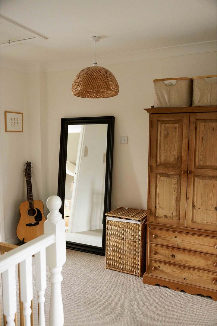 2階の階段踊り場スペースと大人のベッドルームは、白の壁に木製の家具が映えるシンプルな空間。木のベッドフレームや収納家具、籐のかごにランプシェード、コットンのバスケット……と、ナチュラル素材をこだわりのベッドリネンが華やかに彩る。