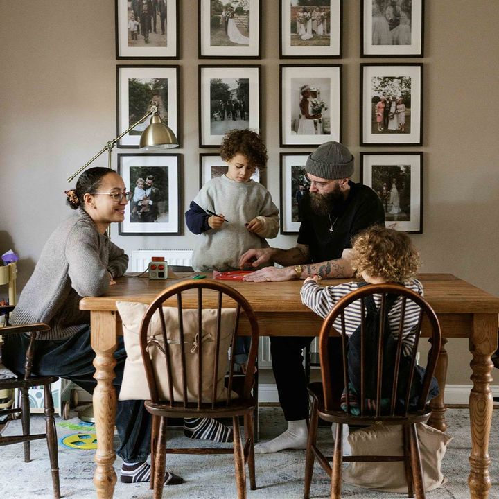 ダイニングスペースは、リビング、キッチン、プレイルームの中央に位置する、家族全員のお気に入りの場所。ジョーさんとローラさんの結婚式の写真を額に入れて整然と壁一面に並べ、まるでギャラリーのような印象に残る空間に。